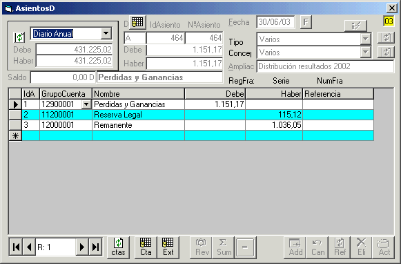 Form para el tratamiento de asientos. Seleccione el Diario, agregue el Tipo de Asiento con su ampliacion , introduzca los apuntes y al finalizar pulse el botón de Actualizar